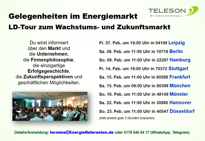 Berufliche Chance im Energiemarkt erkennen und nutzen ?! Kompetente Informationen auf der LD-Tour am 23.10.2025 oder bereits jetzt nach Terminabsprache unter Mobil 0175-2901349 !